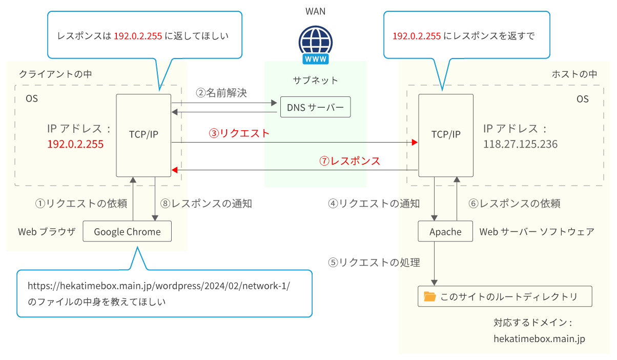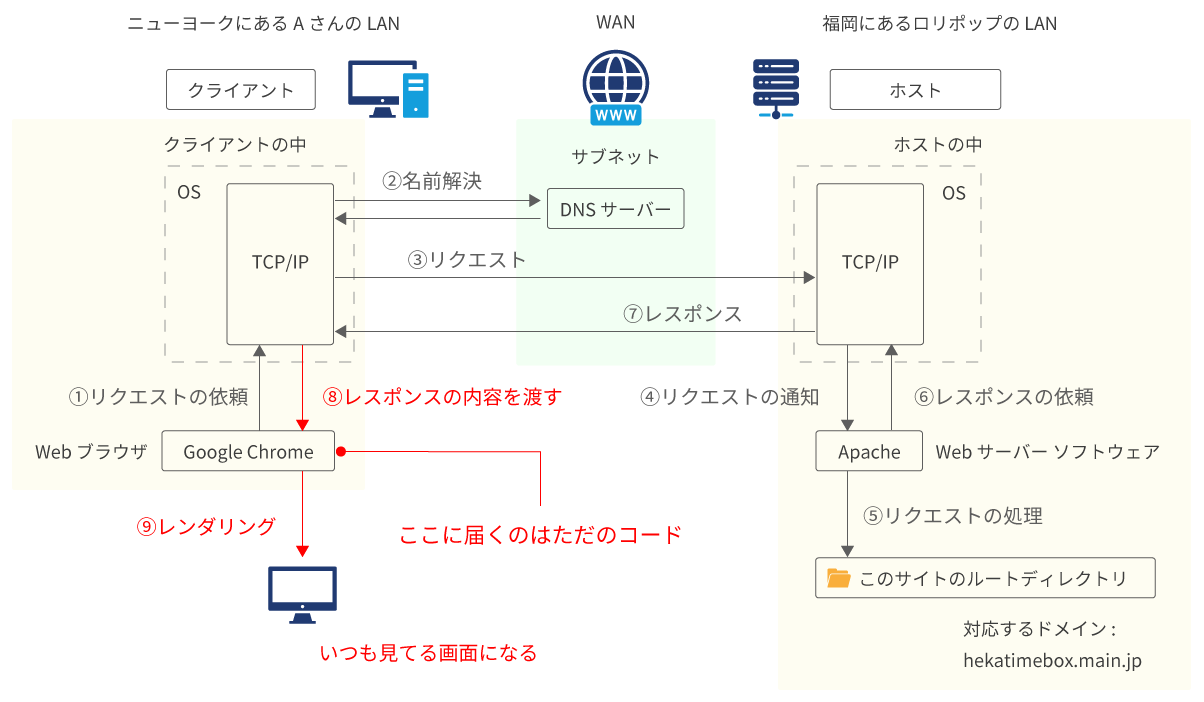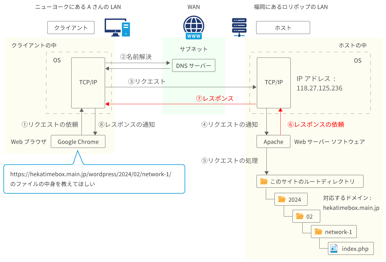 </div><aside id="sidebar" class="sidebar right first"><div id="toc-widget-2" class="widget-box toc_widget slider_fx"><h3 class="inside-title"><span>Contents</span></h3><ul class="toc_widget_list no_bullets"><li><a href="#i">インターネット通信の概観</a><ul><li><a href="#LAN_WAN">LAN と WAN</a></li><li><a href="#_LAN">サーバーも LAN</a></li><li><a href="#WAN">WAN とプロバイダ</a></li></ul></li><li><a href="#i-2">リクエストとレスポンス</a><ul><li><a href="#i-3">リクエスト : サーバーへの送信</a></li><li><a href="#i-4">レスポンス : サーバーからの返信</a></li></ul></li><li><a href="#i-5">まとめ</a></li></ul></div></aside></div><nav id="dp_breadcrumb_nav" class="dp_breadcrumb_nav"><ul><li><a href="https://hekatimebox.main.jp/wordpress/" class="nav_home" data-wpel-link="internal"><span>HOME</span></a></li><li><a href="https://hekatimebox.main.jp/wordpress/category/web-%e3%83%8d%e3%83%83%e3%83%88%e3%83%af%e3%83%bc%e3%82%af/" data-wpel-link="internal"><span>WEB / ネットワーク</span></a></li><li><a href="https://hekatimebox.main.jp/wordpress/2024/02/network-1/" data-wpel-link="internal"><span>インターネット通信のしくみ ① 通信の概観</span></a></li></ul></nav><footer id="footer" class="clearfix wow fadeInDown"><div class="ft-widget-content"></div></footer></div></div><script>function dp_theme_noactivate_copyright(){return;}</script><script src="https://hekatimebox.main.jp/wordpress/wp-content/plugins/data-tables-generator-by-supsystic/app/assets/js/dtgsnonce.js?ver=0.01" id="dtgs_nonce_frontend-js"></script>