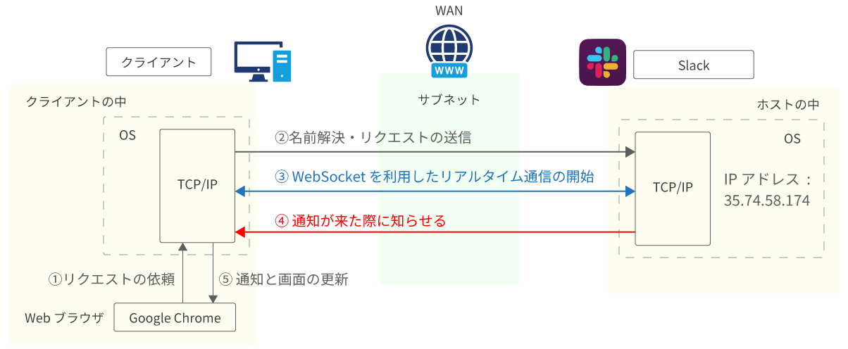 例えば Slack。Slack で通知が入ると「カカッ」っていいますが、あの時 Slack のサーバー側ののタイミングでクライアントにデータが送信されています。