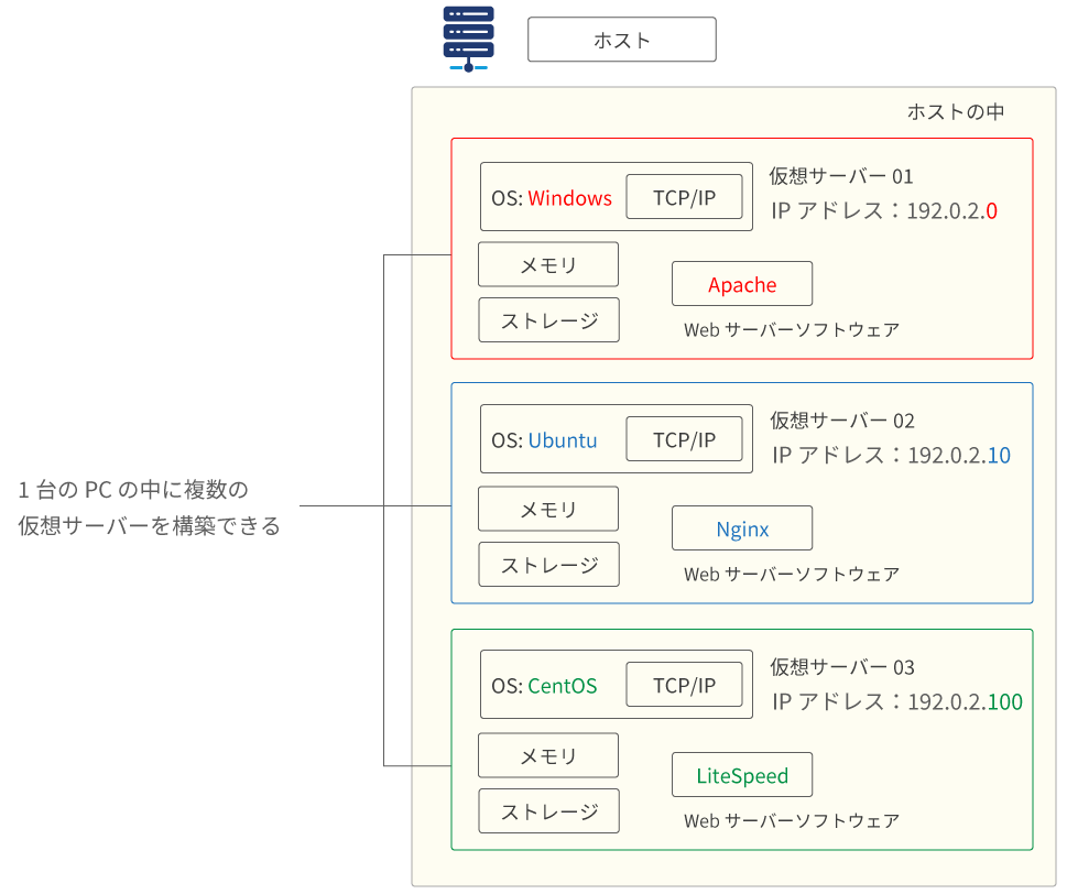 別の OS を入れられるため個別の TCP/IP を持ち、個別の IP アドレスを割り振れます。