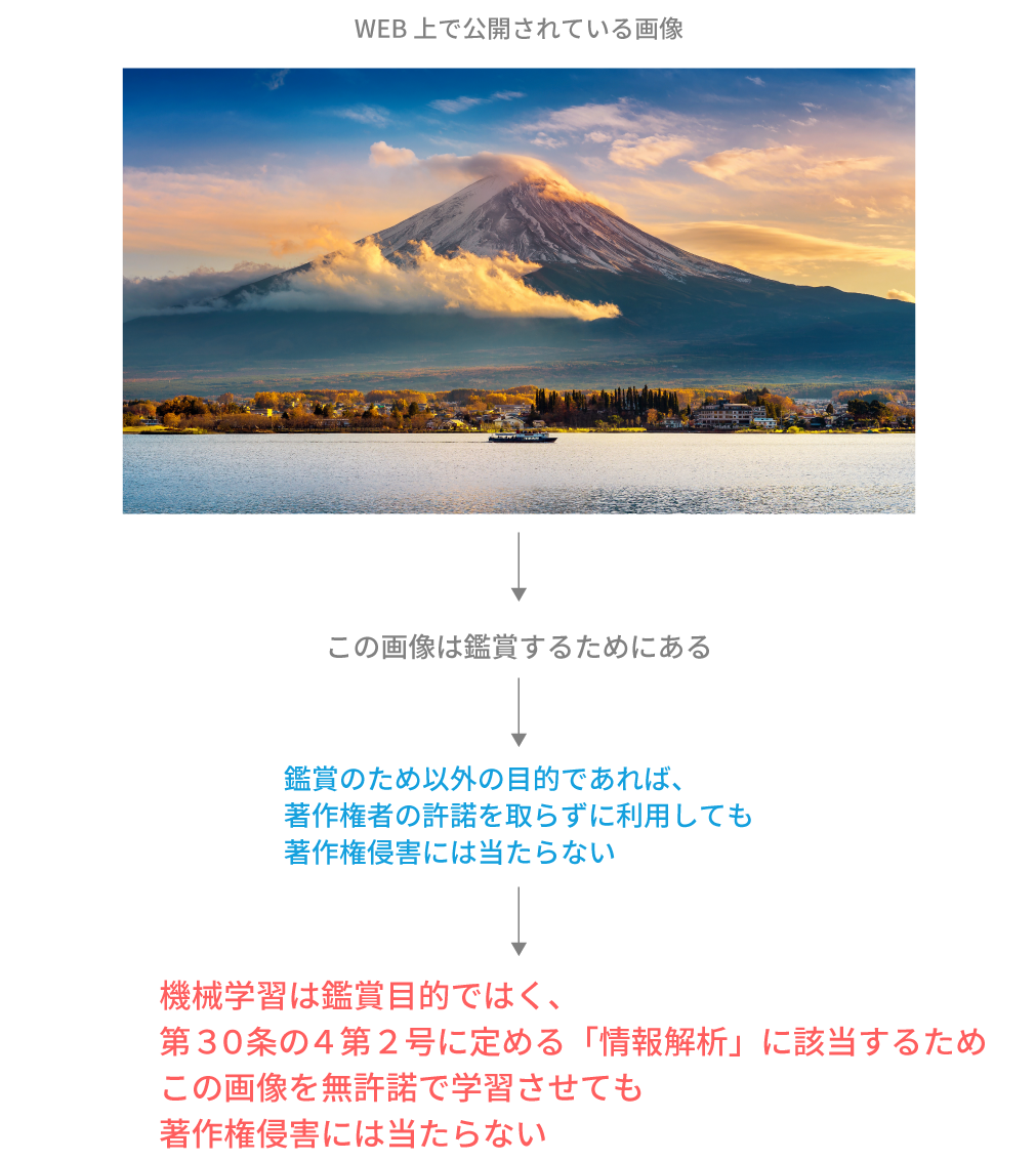 これが著作権法第三十条の四です。日本では機械学習への著作物の利用については基本的に無許諾でよい、という法律になっています。