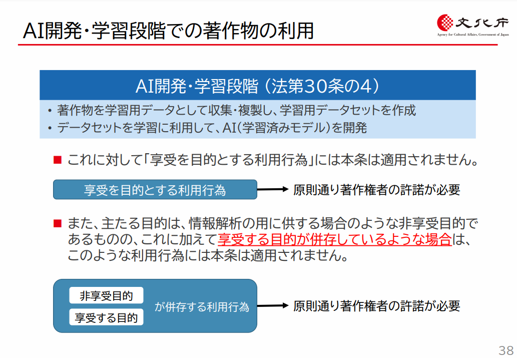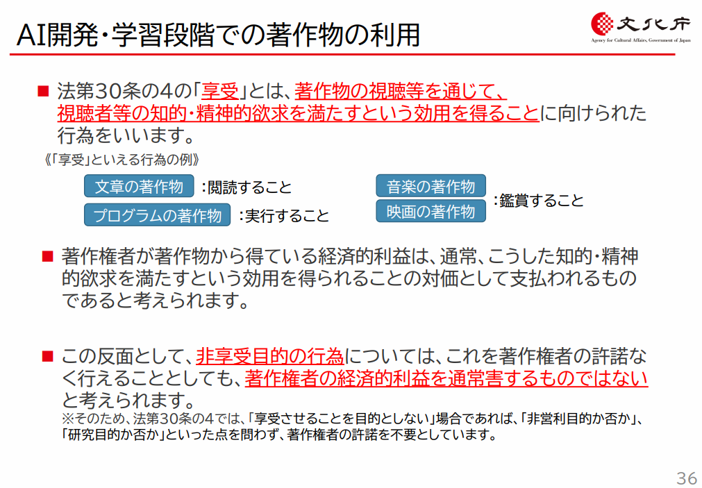 この内容を文化庁が解説してくれています、文化庁の「 AI と著作権」の 36ページを引用します。