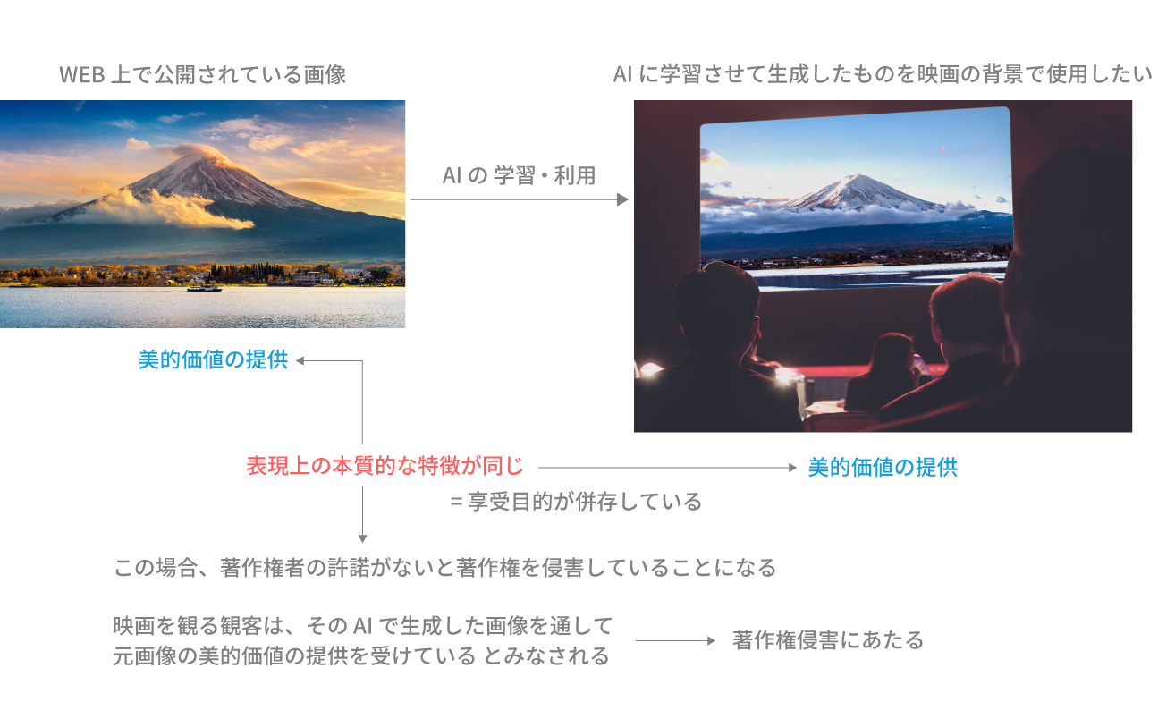 こういった場合に「『非享受目的』と『享受する目的』が併存する」と言っています。つまり、意図的に特定の著作物を生成する AI 開発とその AI の利用行為に関して著作権侵害に当たる、としています。これ以外の、意図的に特定の著作物を生成しない AI であれば著作権侵害に当たりません。