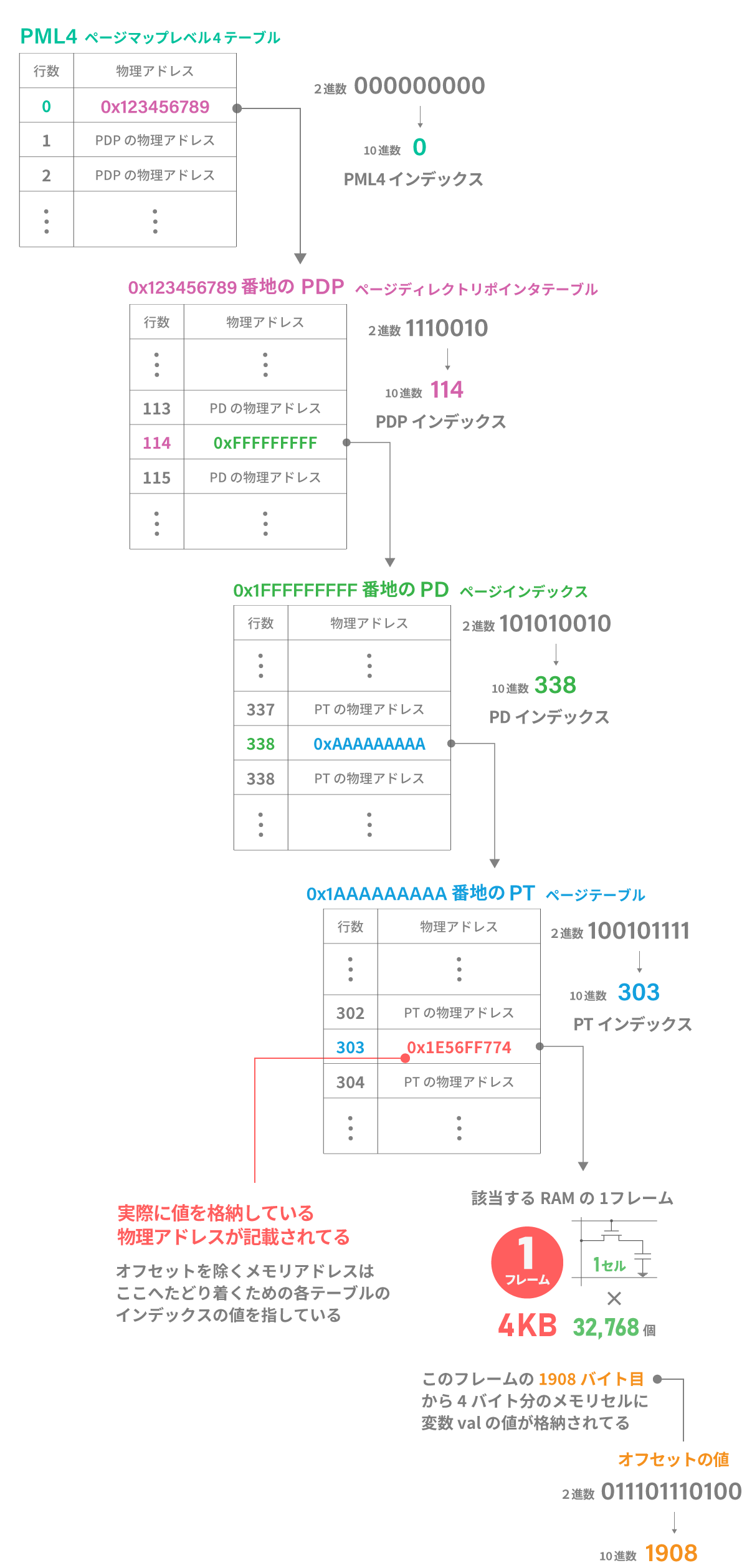 そして、対応する物理アドレスが「1E56FF774」だった場合の物理メモリへの変換工程を追っていきます。