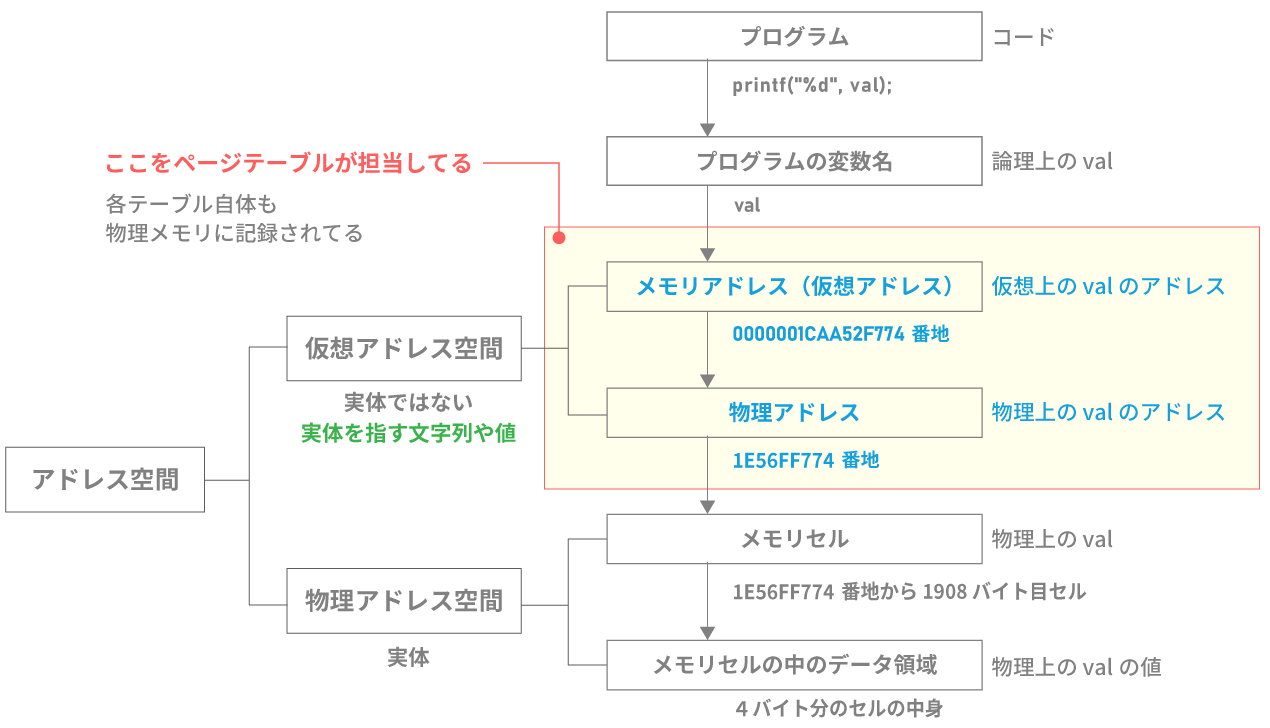 コンピュータはあくまで計算機なので、仮想化された空間をそのまま表現することはできません。コンピュータは階層化された表データで仮想的にアドレス空間を表現しています。
